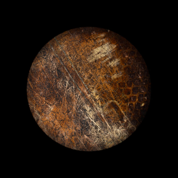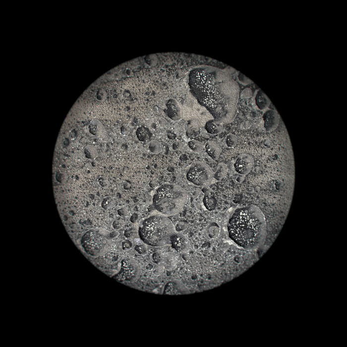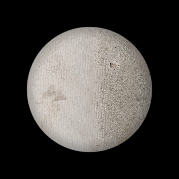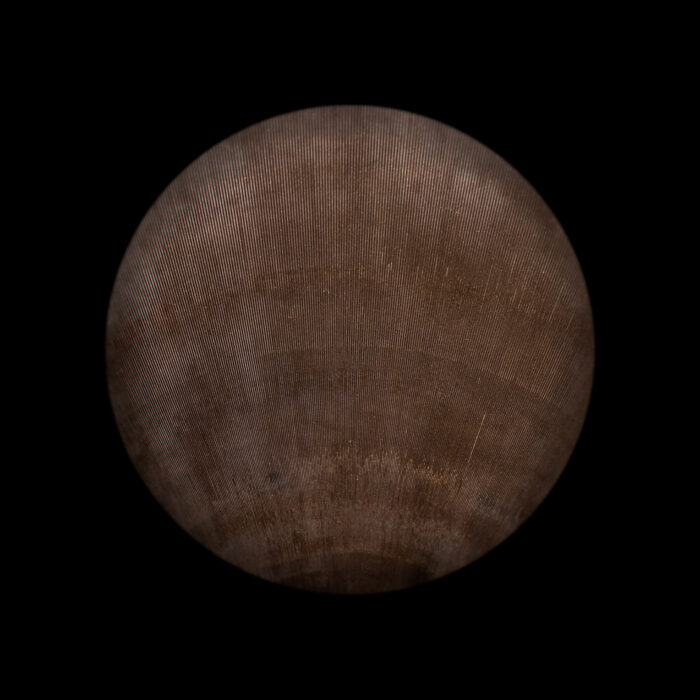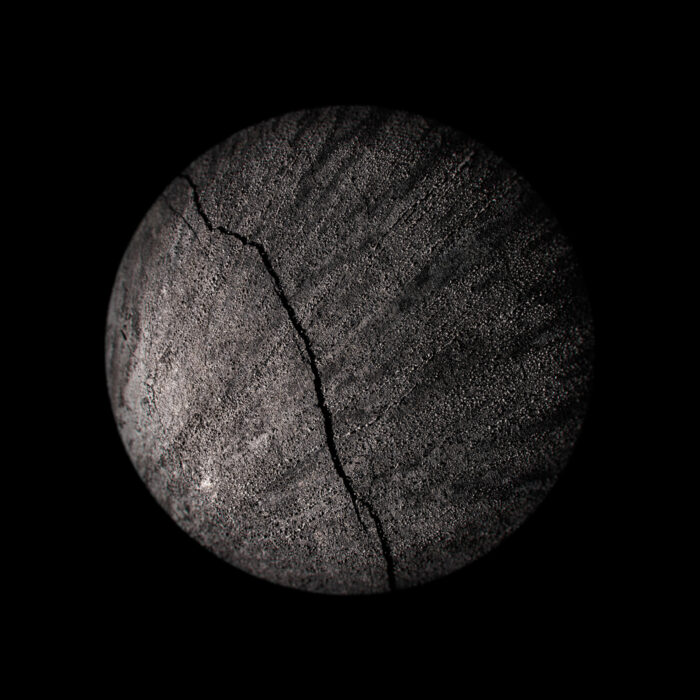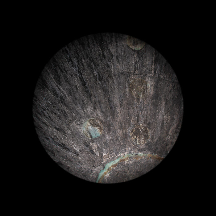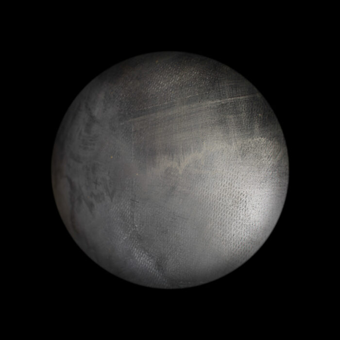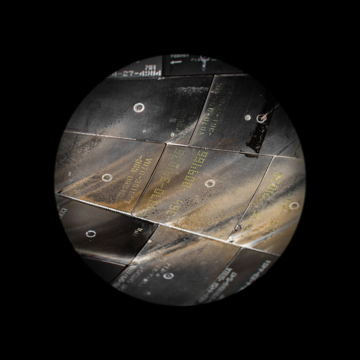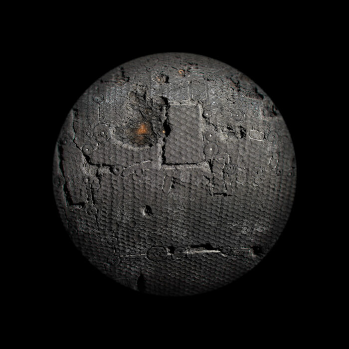 We are intrigued by the mark-making connected with traversing the earth’s atmosphere—a charge imbued upon artifacts that have been to the void and back. Having negotiated access to national repository holdings of rocket bodies, space capsules, and orbiters, we take clinical, abstract, detailed views of the burns, abrasions, and other markings on their surfaces. A soft round treatment for the typological convention draws attention to the act of observation—invoking the telescope, the microscope, and occasionally, the eye itself. In some images, transformed artifacts refer to celestial objects floating in the black void. We imagine that the objects we photograph may hold auras of embodied experience and perhaps our photographs may likewise be vehicles for contemplating going beyond.